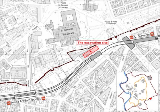 Map of the excavation site in Rome, between the Aurelian walls (black line) and Rome’s Metro line C, near the Basilica of San Giovanni in Laterano (M Bernabei , J Bontadi, R Rea, U Büntgen & W Tegel / PLOS ONE)