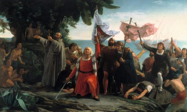 Columbus and the Pinzón brothers arrive in America, Dióscoro Teófilo Puebla Tolín (1831-1901). (Public Domain)