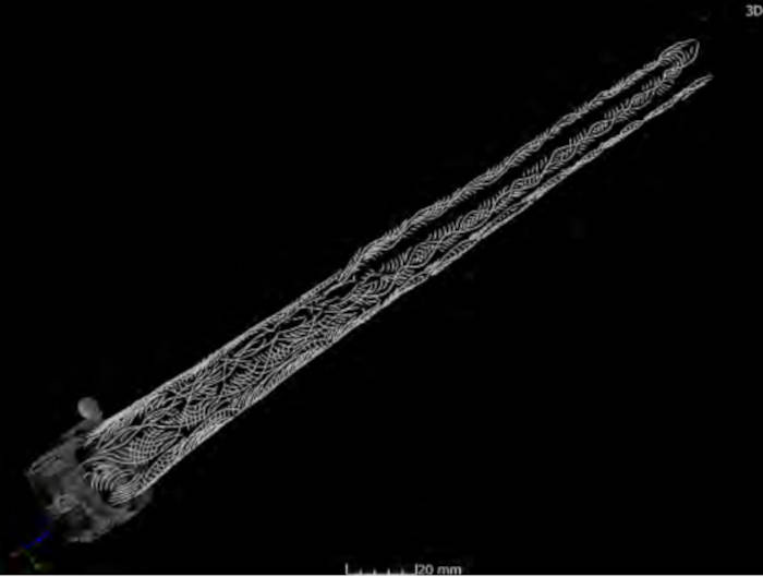 3-D image of the spear through the X-ray of a CT scan. (Preservation and Utilization Council of “Sacred Island of Okinoshima and Associated Sites in the Munakata Region”)