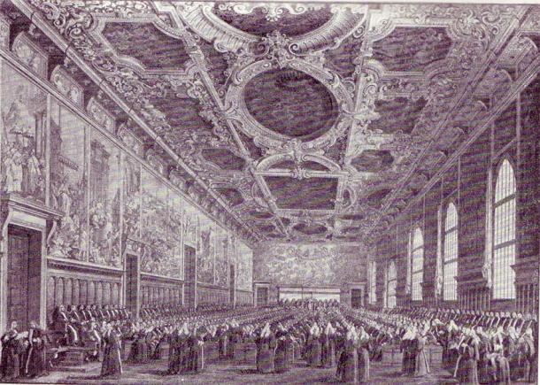 An engraving by Giambattista Brustolon showing the Great Council of Venice. (Public Domain)