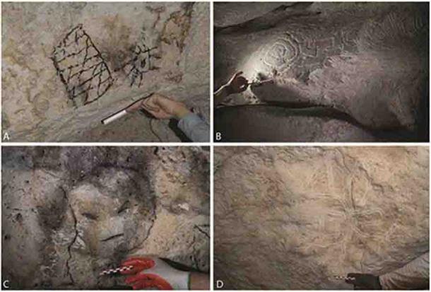 Additive and extractive designs from the dark zones of three caves on the Caribbean island of Mona, midway between Puerto Rico and the Dominican Republic, where thousands of previously unknown Taino drawings and paintings have been revealed in thirty caves on the island. A) charcoal drawn motifs; B) finger-fluted motifs and area of systematic extraction (right hand side); C) charcoal drawn face; D) finger-fluted face with limbs and appendages. (Journal of Archaeological Science / CC BY 4.0)