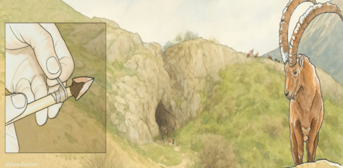 Top image: Obi-Rakhmat rock shelter in Uzbekistan, micro-point hafting and main game hunted around the site 80,000 years ago. Source: Artwork courtesy of Malvina Baumann/CC BY 4.0