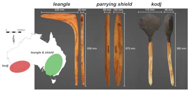 The kodj (far right) is a weapon originating from the southwest of the Australian continent (red), while the leangle and parrying shield originate from the southeastern side (generally found in the green area). (B. Cornish and M. Langley/Scientific Reports)