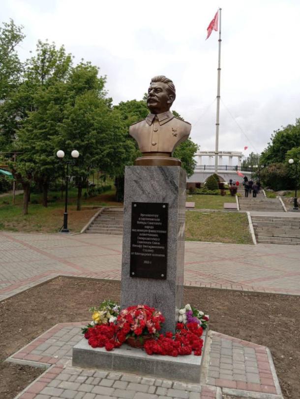 New bust of Joseph Stalin erected in Russian-occupied Melitopol, Ukraine, on May 9, 2025. (X/Nexta TV).