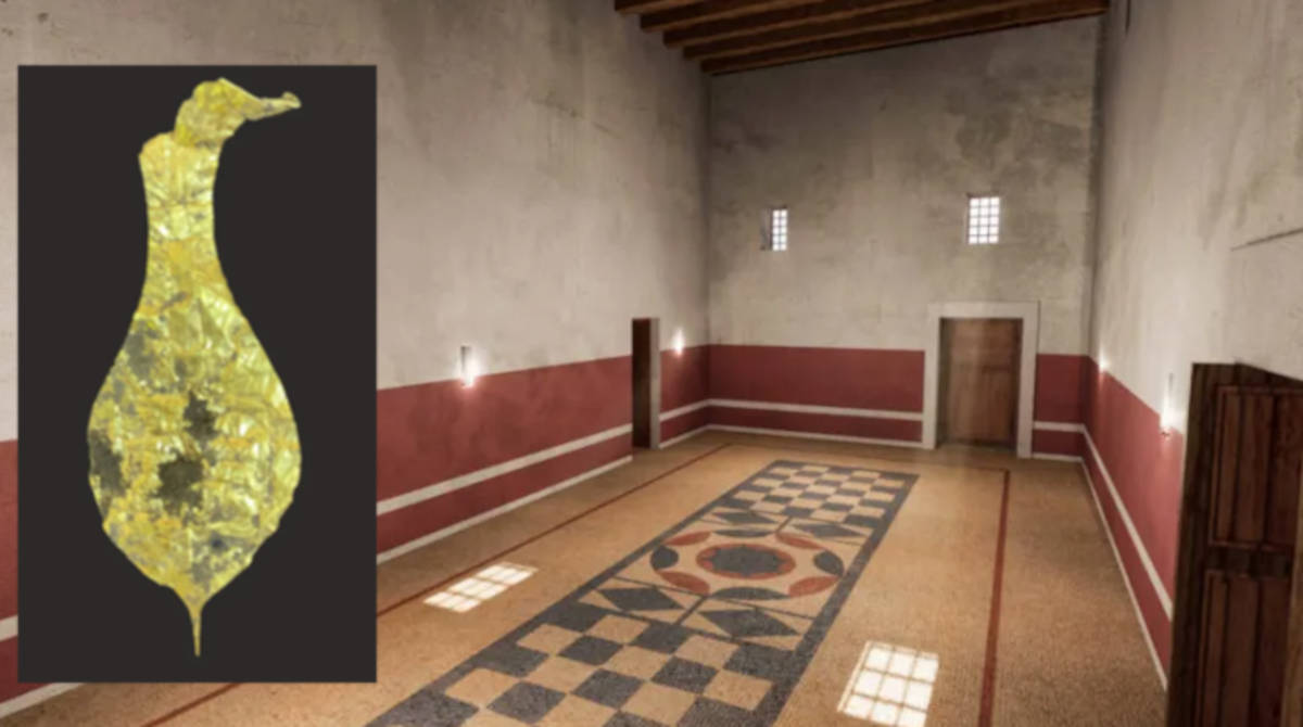 Top image: Attempt to reconstruct a room in the house of the garrison commander in Asparos. Inset; the gold votive plaque. Source: Radosław Karasiewicz-Szczypiorski and Mateusz/PCMA Osiadacz. Inset; Natalia Lockley/PCMA