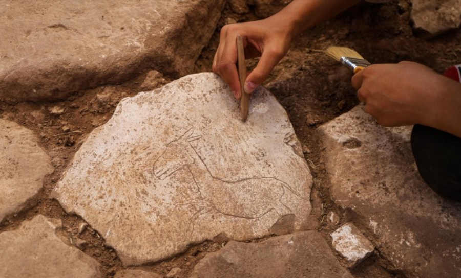 “The building is sunk into the ground, has a short stone wall and a branch-knitted roof system. We understand that the ground was paved with large flat stones. Some of these stone pavements were used as grinding stones, and we came across a wild donkey motif on one of them”.