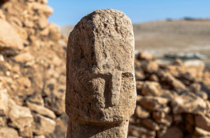 A close-up view of the 12,000-year-old T-shaped pillar featuring a human face discovered at Karahantepe in southeastern Turkey. (Ministry of Culture and Tourism)