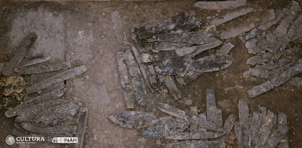 Top image: Votive offering of obsidian knives discovered at Tlatelolco site, Mexico City. Source: INAH