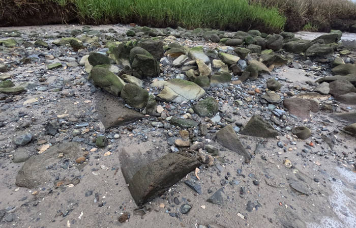 Top image: Large section of possible La Fortuna shipwreck exposed on Brunswick Town shoreline. Source: ECU Program in Maritime Studies