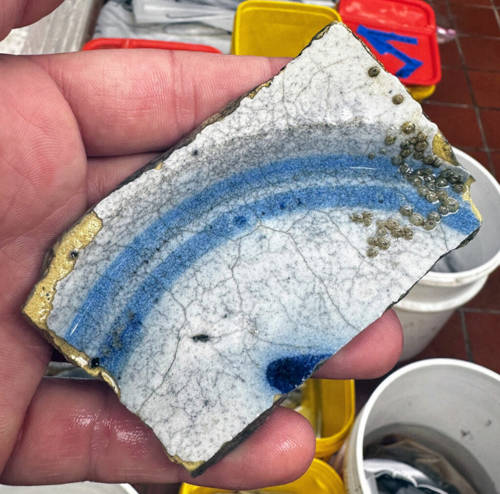 Spanish majolica pottery fragment recovered from the site. (Jeremy Borrelli/ ECU Program in Maritime Studies)