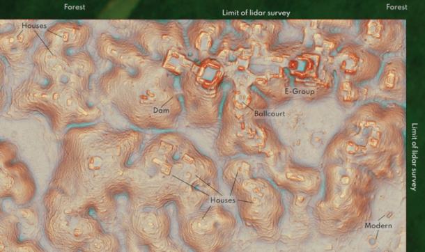 Lidar map of one of the sites discovered, indicating buildings such as houses and a ballcourt. (Luke Auld-Thomas/Antiquity Publications Ltd)