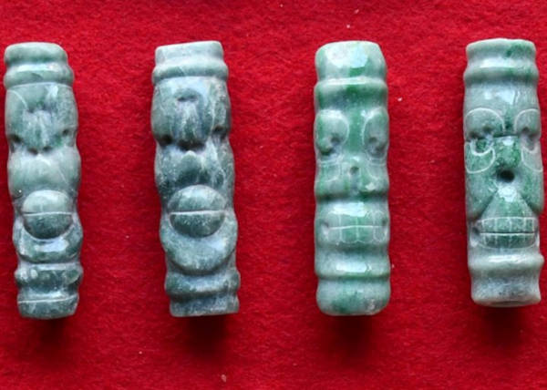 Four jadeite tubular beads depicting live and dead spider monkeys, demonstrating the sophisticated jade-working techniques and symbolic animal imagery of ancient Maya craftspeople.