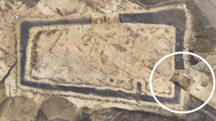 What first looked like another grave - a long oval pit around two meters long with a stone slab at one end - kept going. As excavators followed the fill downward, it sloped into the firm loess subsoil and opened into a tight, curving corridor, revealing the feature was not a burial at all but an underground system.