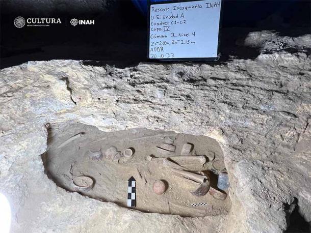 The double-chambered stone Mixtec tomb was revealed by road workers in the main public square of San Juan Ixcaquixtla. Comprising two rooms measuring four meters by two meters (approximately 13.12 feet by 6.56 feet), the researchers identified three individual burial deposits within the Mixtec tomb. These contained the skeletal remains of at least 20 individuals that correspond to the Classic Mesoamerican period (AD 100 to 650).