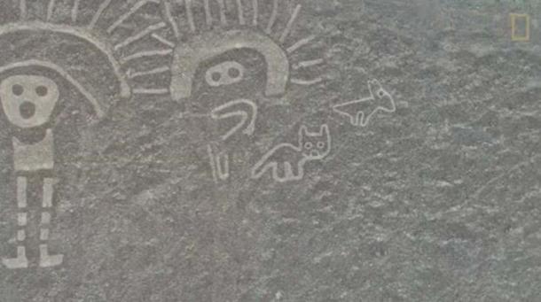 Top Image: A depiction of a flying human tethered to a monkey. The geoglyphs pre-dating the Nazca lines show many more human designs. Source: National Geographic