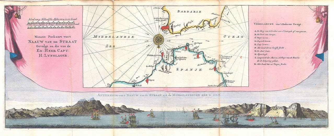 Top image: 1747 map of the Straits of Gibraltar showing the Rock of Gibraltar, the Barbary Coast and 16 sailing ships; based upon the charts of Dutch navigator Hendrik Lynslager. Source: Public Domain