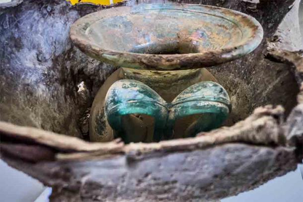 In addition, grave goods including two glass unguentaria and numerous fragments of what appears to be fabric have been found in the chamber.