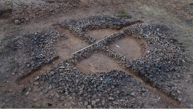 Top image: The remains of a kurgan burial mound found in Kazakhstan with two stone ridges known as "mustaches." Source: Courtesy of the Margulan Institute of Archaeology