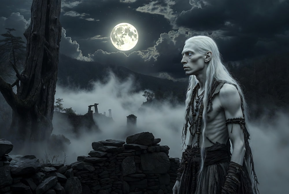Top Image: A hauntingly beautiful AI-generated image in landscape format: Under a luminous full moon, a pale-skinned albino Native American with long white hair stands guard among ancient stone ruins in the misty Appalachian Mountains.
