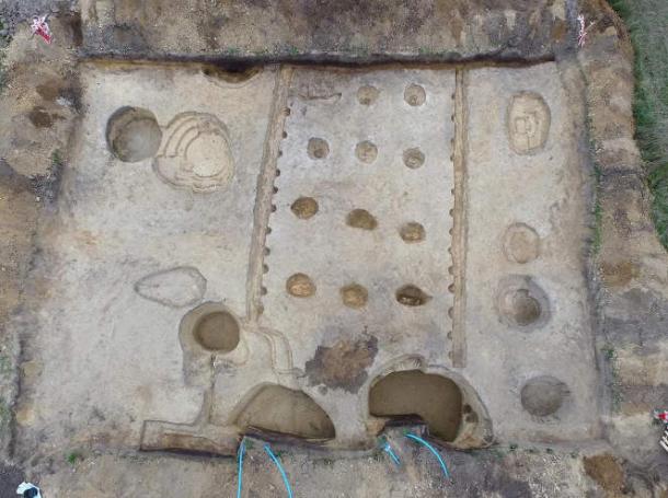 Aerial view of 6,000-year-old Neolithic long house uncovered in Sandomierz-Mokoszyn, Poland. (M. Bajka/Voivodeship Department of Monument Protection in Kielce)