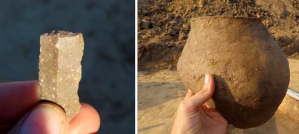 Left; Scraper made of Świeciechów flint of the Funnel Beaker culture. Right; Fragment of a vessel from the Linear Pottery culture. (M. Bajka/Voivodeship Department of Monument Protection in Kielce)