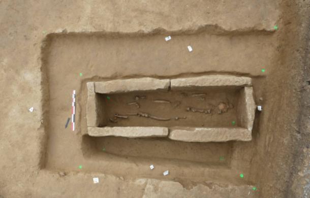 View of a burial contained in a coffered tomb from the early Middle Ages (600-700 AD), Pfulgriesheim (Bas-Rhin), 2024. (© Yasmine Mechadi/Inrap)