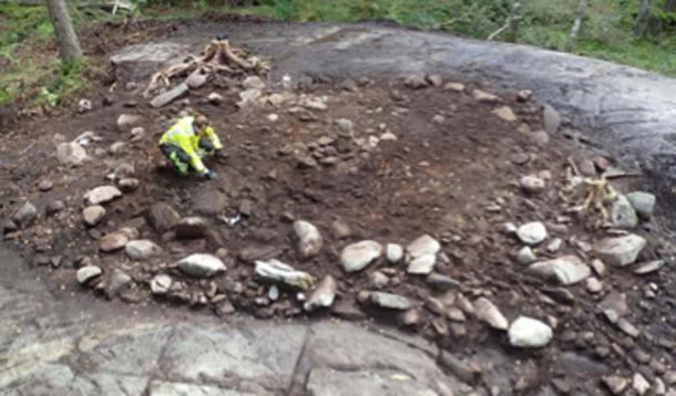 The site where the stone penis was found under the stone-setting. (The Archaeologists/NHM)