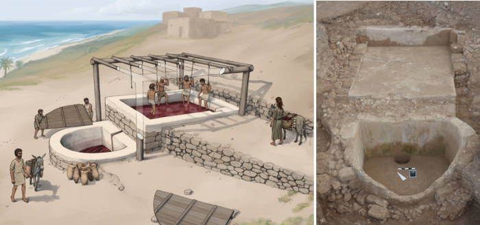 Top image: The large Iron Age wine press at Tell el-Burak showing sophisticated Phoenician construction techniques using hydraulic lime plaster with ceramic aggregates. Source: Tell el-Burak Archaeological Project / Antiquity