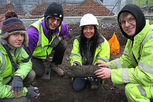 Janey Green and her team of excavators with the wooden door post found at Sutton Farm. Credit: Baskerville Archaeological Services
