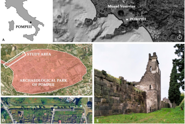 Top image: Location of the study area showing Pompeii's northern walls between Vesuvio and Ercolano Gates, with the study area highlighted. Source: Rossi et al., Heritage / CC BY 4.0