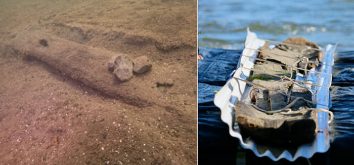 Top image: The remains of an ancient canoe on the bottom of Lake Mendota. Source: Tamara Thomsen/ Wisconsin Historical Society via AP