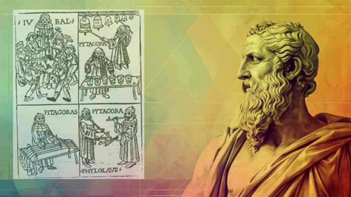 Top image: Greek Philosopher Pythagoras with overlay of woodcut showing Pythagoras with bells, a kind of glass harmonica, a monochord and (organ?) pipes in Pythagorean tuning. From Theorica musicae by Franchino Gaffurio, 1492 (1480?) Source: Khuram Ibn Sabir/Adobe Stock, overlay Bibliothèque nationale de France/Public Domain
