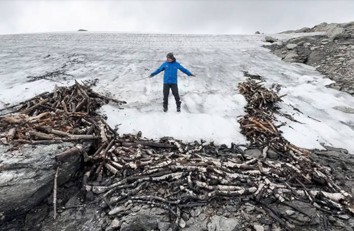Top image: Hundreds of wooden posts emerging from melting ice on the Aurlandsfjellet mountain plateau in Vestland County, Norway, mark the location of a 1,500-year-old reindeer trapping system - the first wooden mass-capture structure ever found in Norwegian ice. Source: Thomas Bruen Olsen/University Museum, UiB