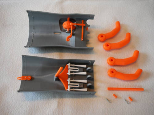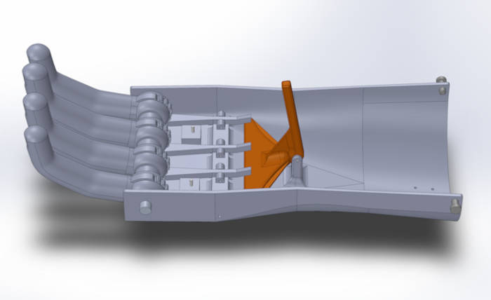 This view of the computer-aided design file of a strengthened version of the model, which includes ribs and fillets to reinforce the plastic material, highlights the main release lever in orange. (Peden Jones/CC BY-SA)
