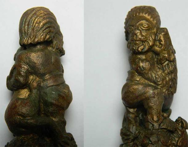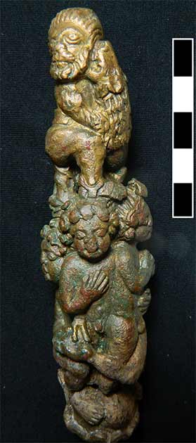 The upper half of the Roman Britain bronze key handle showing the rear and front of views of the man and lion. (G. Speed / University of Leicester Archaeological Services)