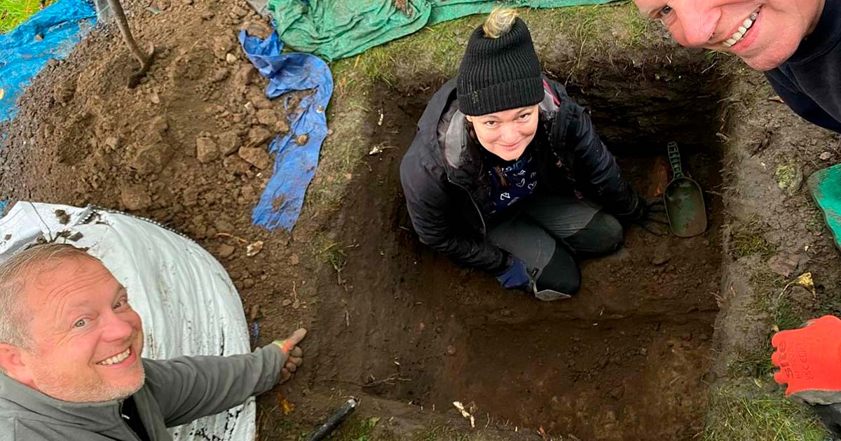 Top image: Dr Murray Cook (bottom left) and other members of the dig with the remains of the ancient Roman Road in Stirling, Scotland. Source: Stirling Council