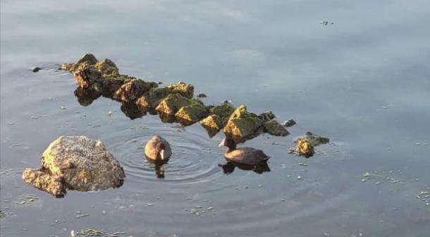 A pair of duck archaeologists examine ruins from Roman villa popping up out of the waters of Lake Fusaro. (Josi Gerardo Della Ragione).