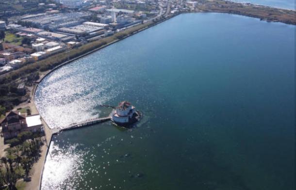 High aerial photo of Lake Fusaro, with Roman ruins visible just below the circular building on the lake. (Josi Gerardo Della Ragione).