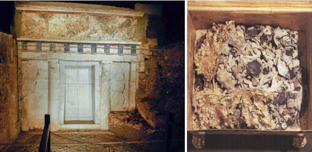 Top image: Left; Facade of Tomb II in Vergina, Greece. Right; Bones and textile fragments from the tomb. Source: Left; Panegyrics of Granovetter (Sarah Murray)/Public Domain. Right; Theodore G. Antikas