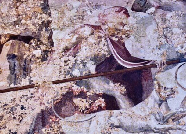 Part of the frieze of Tomb II showing hunter six (Alexander the Great) wearing a sarapis with two whitish stripes (layers) between the purple ones, which correspond to those of the material in the male ossuary of Tomb II. (A. Bartsiokas/Journal of Field Archaeology)