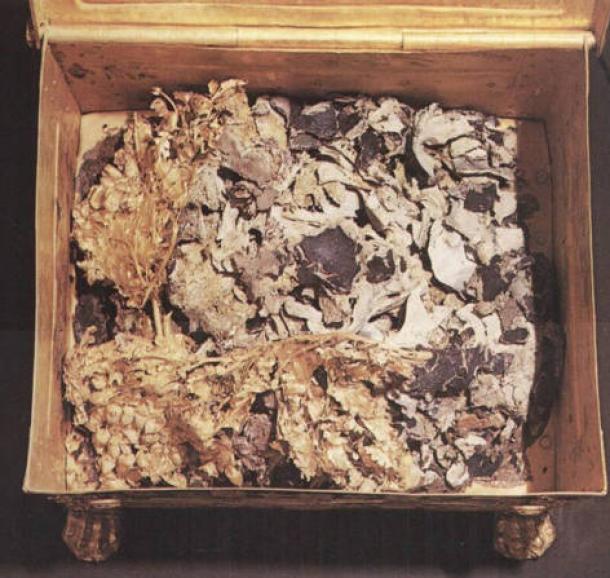 Male bones and textile fragments discovered in the Tomb II that are believed to be pieces of the tunic of Alexander the Great. (Theodore G. Antikas et al.)