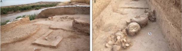 Top image: Aerial view of excavation spot at Shakhi Kora where bevelled clay bows and pillared structures were found. Source: Sirwan Regional Project/Antiquity Publications Ltd.