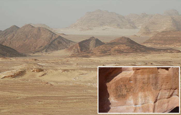 Top image: Sinai desert landscape, Egypt. Inset; the inscription found at Wadi Khamila, Sinai. Source: Tommy from Arad/CC BY 2.0; Inset; M. Nour El-Din/redrawing: E. Kiesel/IDW