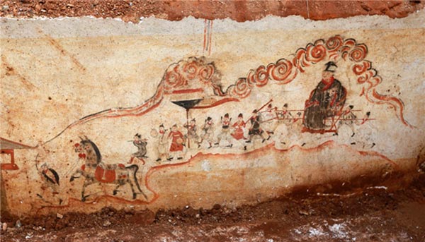 Featured image: Figure paintings were found on the wall of an ancient tomb unearthed in Qunyi village, Wanbao town, Loudi city, Hunan province, Oct 14, 2014. [Photo by Guo Guoquan/Asianewsphoto]