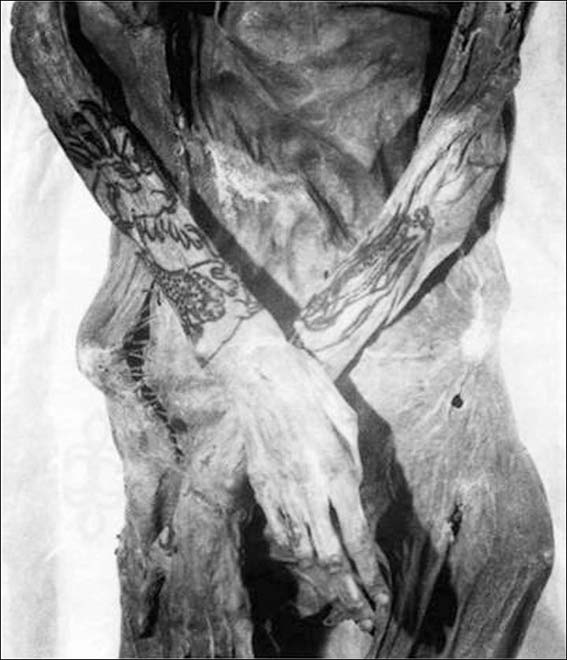 The tattoos - with the images shown here - depict a feline predator, probably a tiger, on the man's left shoulder and a horse on the right shoulder. On the forearm of the right hand is an Asiatic wild ass or horse and some predator with a striped tail. These figures cannot be seen in full because of skin folds.