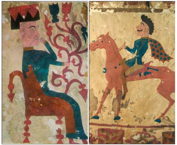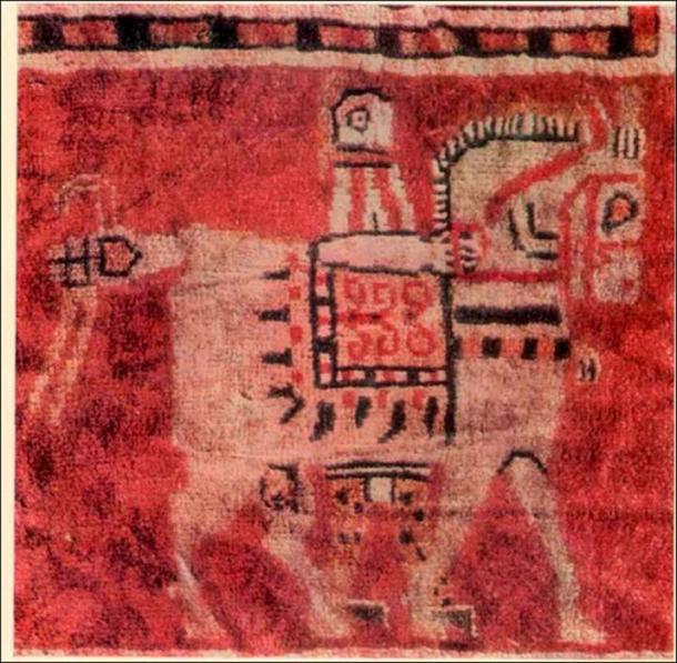 Two precious carpets lay undisturbed, the most ancient ever found. One was made of felt - 4.5 by 6.5 metres in size; it was probably originally a wall hanging. It was decorated with multi-colour applique including sewn figures more than 1 metre in height, carved from fine coloured felt. The central scene shows a rider approach a throne on which a goddess is seated with a flowering branch in her hand.