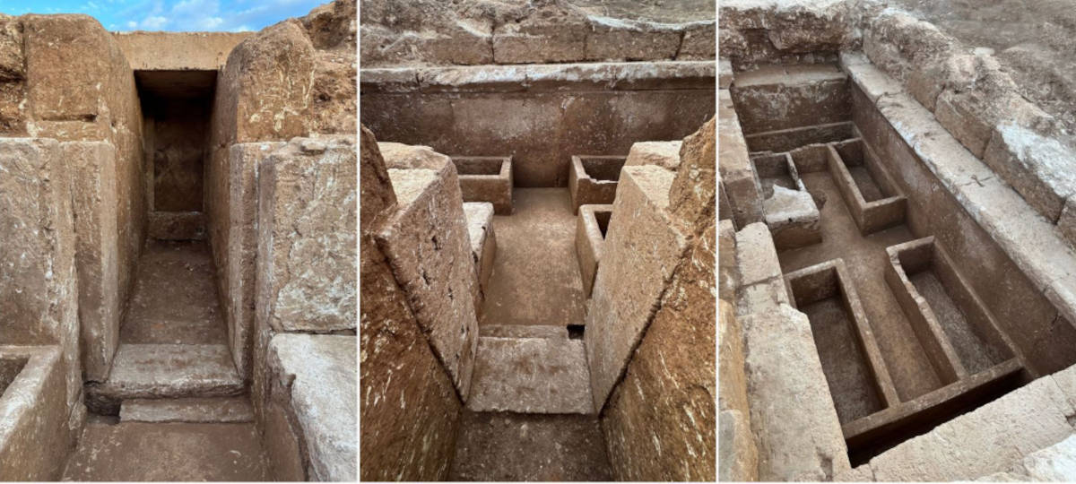 Top image: Different views of the newly discovered tomb at an excavation site for ancient Greek city of Tenea.