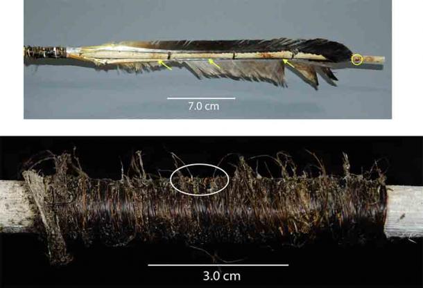 At just over 2 meters (6.6 ft) in length, the Yukon throwing dart is made up of three different birch wood sections. At one end there is a chert point which has been secured into place with sinew. The other end still has the original feathers in place, attached to the wood with sinew wrapping. According to Sci News, “it is the most complete example of an atlatl-type dart recovered from an ice patch to date.”
