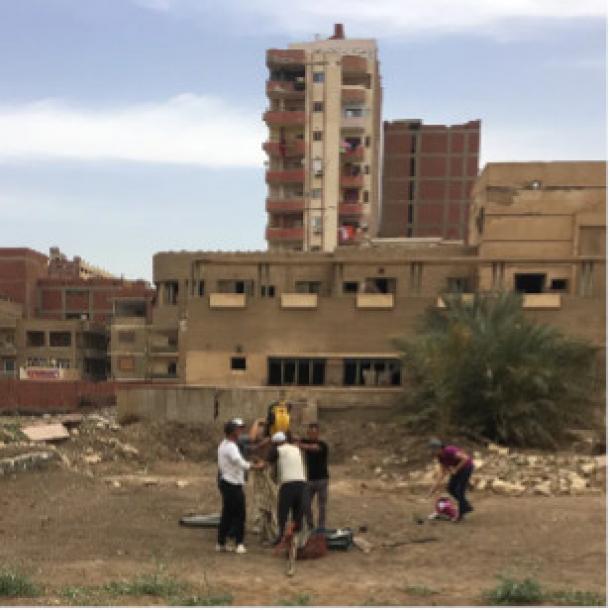 Researchers drill a sediment core in Giza, once the Khufu Harbor. (Nick Marriner/Geology)