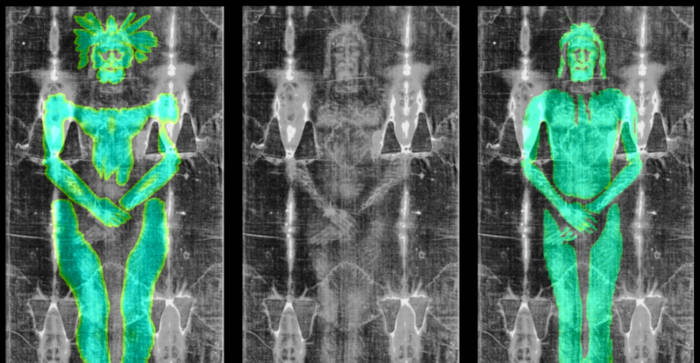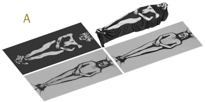 Top image: (A) Overlay of the texture generated by the 3D model onto the image of the Shroud of Turin, showing misalignment in anatomical proportions. (B) Original image of the Shroud. (C) Overlay of the texture generated by the low-relief model, demonstrating greater compatibility with the Shroud image, especially in the torso and head regions. Source: Archaeometry (2025)